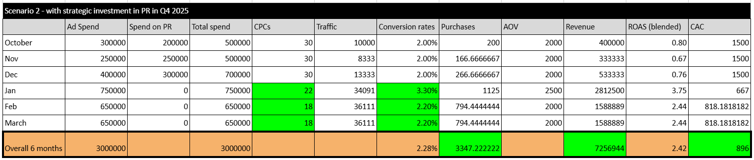 In this model, I’ve intentionally assumed there is no direct short-term revenue benefit from PR in Oct–Dec, even though in reality PR almost always drives traffic spikes.